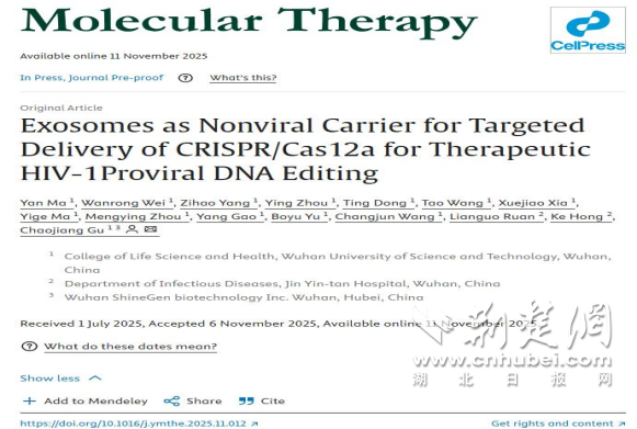 荆楚网(湖北日报)(记者林珊通讯员程宇通讯员毕浩阳)今年12月1日是第38个世界艾滋病日。中国科研团队研发的艾滋病新治疗方案发表在国际领先期刊《分子治疗》上,为实现“终结艾滋病”目标提供了新的科学路径。该研究由武汉科技大学生命与健康科学学院顾朝江教授团队完成。研究小组构建了一种名为“EMT-Cas12a”的新治疗系统。该系统利用工程外泌体提供基因编辑工具,实现艾滋病毒基因组的精确去除。